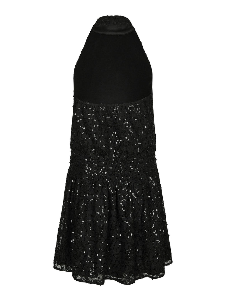 Halter neck dress with an open back. The dress comes in a lace quality with sequins on it. The model is 176 cm tall and is wearing a size 36.