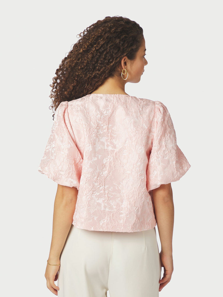 Blouse with puff sleeves and button closure at the front. It has a nice structured quality. Can be used as a jacket as well. The model is 176cm and wears a size 36.
