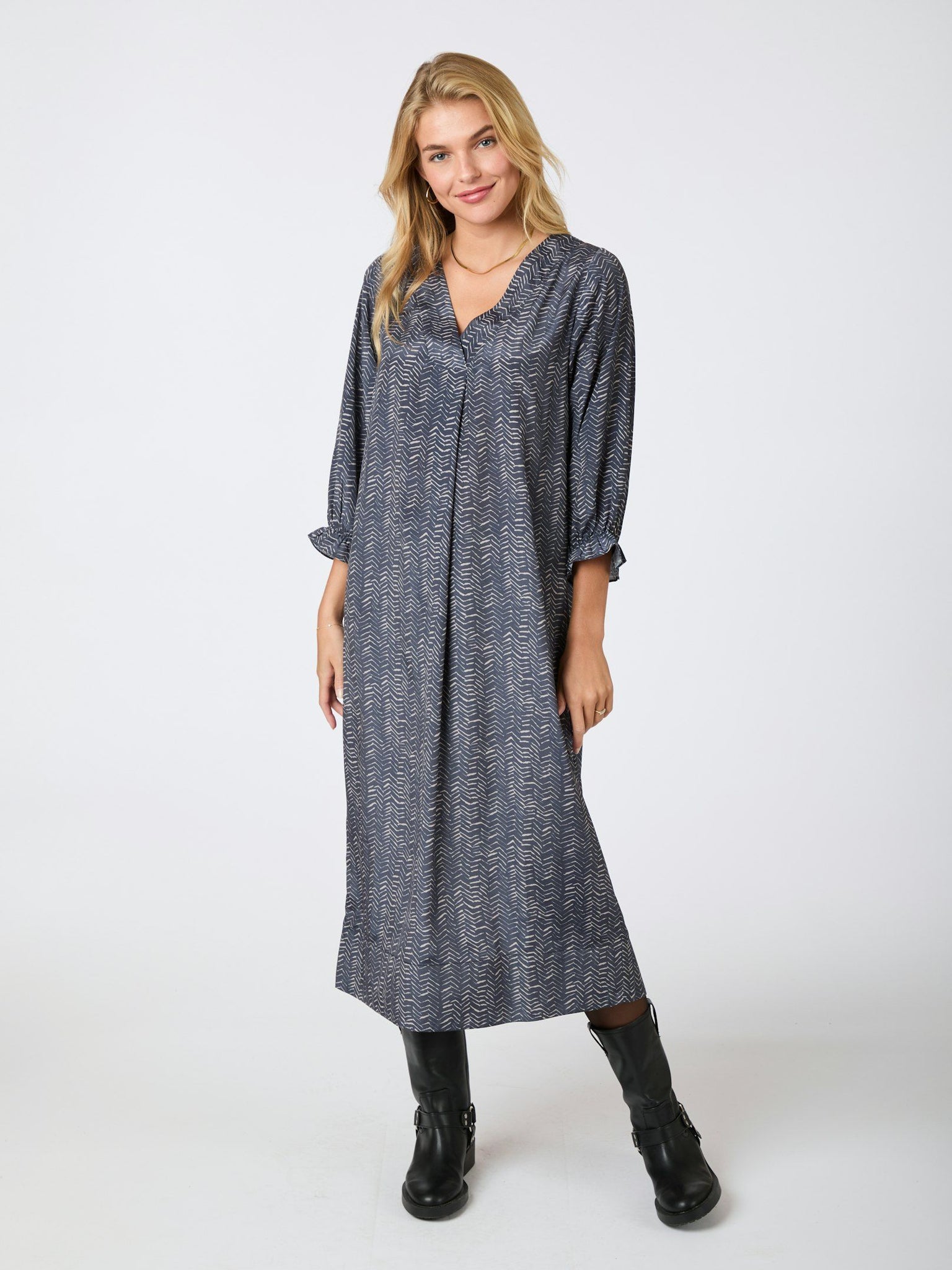 Loose dress in a graphic print. The dress have a nice V-neck and 3/4 s leeves. The model is 176cm and wears a size 36.